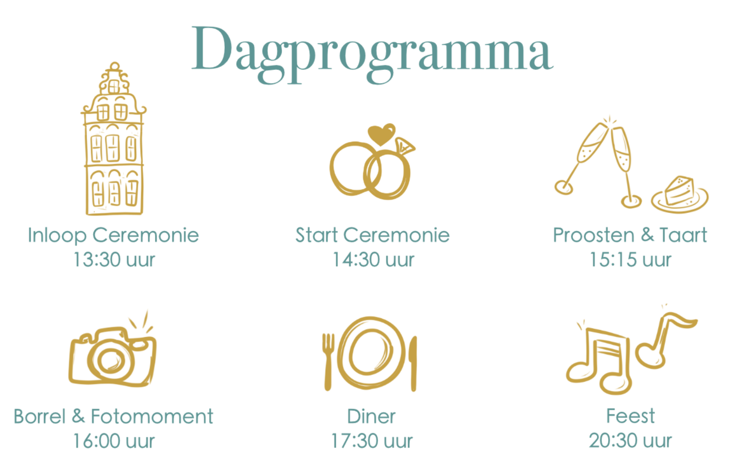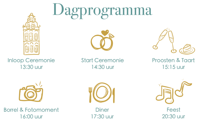 We heten je welkom vanaf 14.00 uur. De ceremonie start om 14.30 uur. We raden aan om op tijd aanwezig te zijn zodat iedereen rustig kan plaatsnemen voordat de ceremonie begint.
