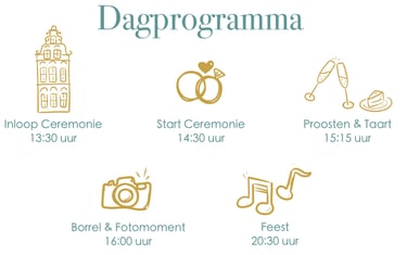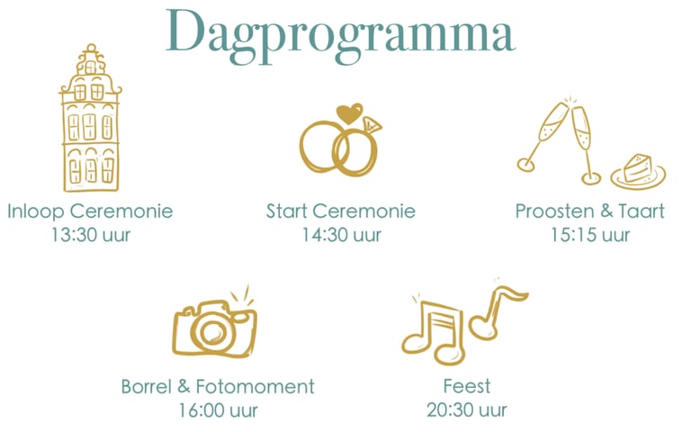We heten je welkom vanaf 14.00 uur. De ceremonie start om 14.30 uur. We raden aan om op tijd aanwezig te zijn zodat iedereen rustig kan plaatsnemen voordat de ceremonie begint.